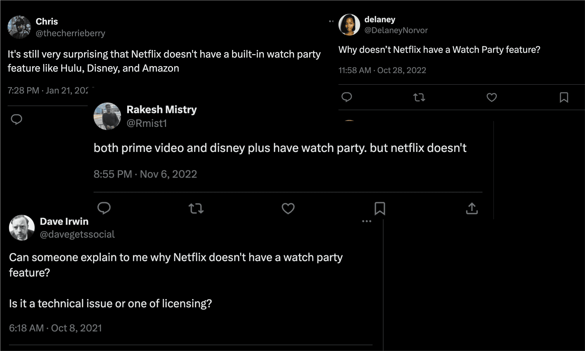 Nearly all of Netflix's competitors have recognised this need for humans to have a sense of community in spite of the digital age, and to the effect, they all have a version of a Watch Party feature built into nearly all of their products. As the biggest movie and TV streamer in this market (by user base), Netflix has the opportunity to play its part in alleviating loneliness through an in-built group-streaming feature that allows friends and family to enjoy video content remotely.