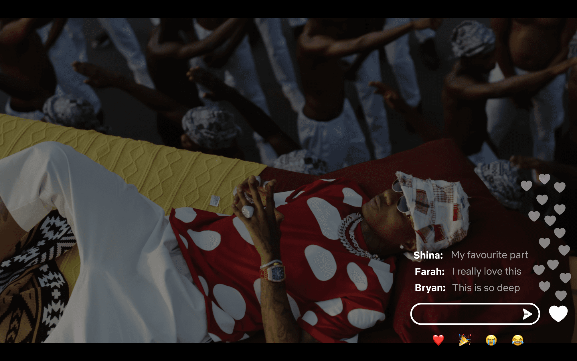 Live chat feature with emoticons minimal and by bottom right of an paused screen to avoid distracting from the content being streamed. (Note: Users who don't want to participate in a live chat will be able to toggle the live chat feature off and on with first top right button.)